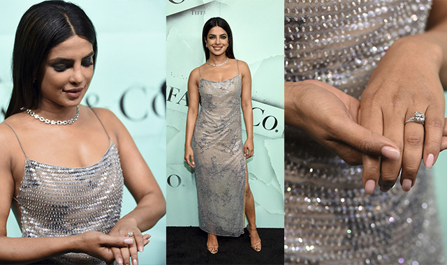 Priyanka Chopra looks at her engagement ring at the Tiffany & Co. 2018 Blue Book Collection: The Four Seasons of Tiffany celebration at Studio 525, in New York.