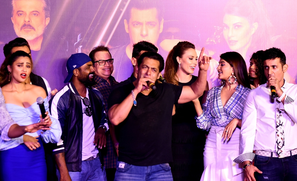 Salman Khan attends with cast and singers the music launch of the upcoming action thriller Hindi film 'Race 3' in Mumbai. (AFP)