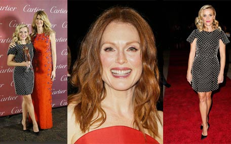Reese Witherspoon, from the film "Wild," poses backstage holding the Chairman's Award with presenter actress Laura Dern at the 26th Annual Palm Springs International Film Festival Awards Gala in Palm Springs, California. (Reuters)