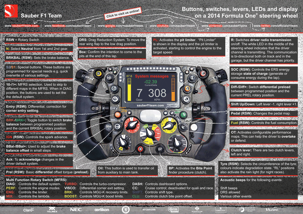 In this detailed graphic put out by the F1 Sauber team on Twitter, the steering of a Formula One car is revealed... and with all the buttons, switches, levers, LEDs and displays, it certainly suggest having great control of a video game controller could be a big advantage for future F1 hopefuls.