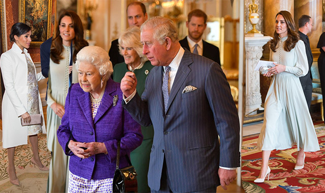 Britain's Prince Charles, Prince of Wales (C) walks with his mother Britain's Queen Elizabeth II (2L), and his wife Britain's Camilla, Duchess of Cornwall (3L), and his sons and their wives, Britain's Prince William, Duke of Cambridge (4L) and Britain's Catherine, Duchess of Cambridge (L), and Britain's Prince Harry, Duke of Sussex, (2R) and Meghan, Duchess of Sussex (R) during a reception to mark the 50th Anniversary of the investiture of The Prince of Wales at Buckingham Palace in London on March 5, 2019. The Queen hosted a reception to mark the Fiftieth Anniversary of the investiture of Britain's Prince Charles, her son, as the Prince of Wales. Prince Charles was created The Prince of Wales aged 9 on July 26th 1958 and was formally invested with the title by Her Majesty The Queen on July 1st 1969 at Caernarfon Castle.
