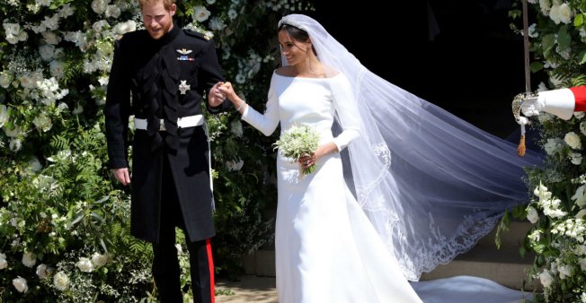 The bride wore a dress by British designer Clare Waight Keller for Givenchy who designed a silk boat-necked gown and long veil accompanied by a traditional long train.