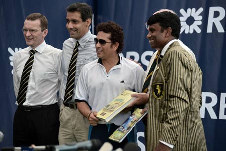 Sachin Tendulkar poses for photographs with officials at the Singapore Cricket Club. (AFP)