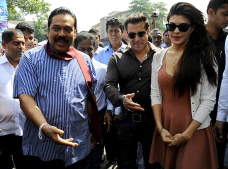 Sri Lanka President Mahinda Rajapakse (L) gestures with Indian Bollywood film actor Salman Khan (C) and Sri Lankan Bollywood film actress Jacqueline Fernandez at a free medical clinic organised to drum up support for President Rajapakse who is seeking re-election at a January 8, 2015 poll, in the capital Colombo. (AFP)