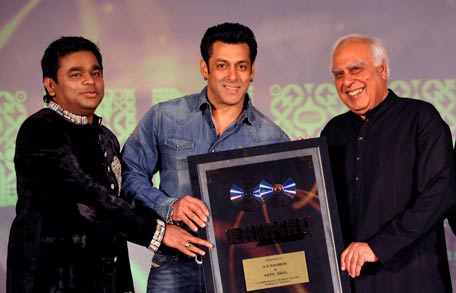 Salman Khan is flanked by Indian composer A.R. Rahman (L) and Indian Law and IT Minister Kapil Sibal (R) during the launch of the music album Raunaq, a collaboration between Rahman and Sibal. (AFP)