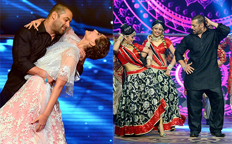 Salman Khan dances with Sonam Kapoor during a promotional event for the forthcoming Hindi film ‘Prem Ratan Dhan Payo’ in Mumbai. (AFP)