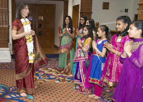 Samantha Cameron, wife of British Prime Minister David Cameron, greets a group of young women during a visit to the Hindu temple Shri Swaminarayan Mandir in London. (REUTERS)