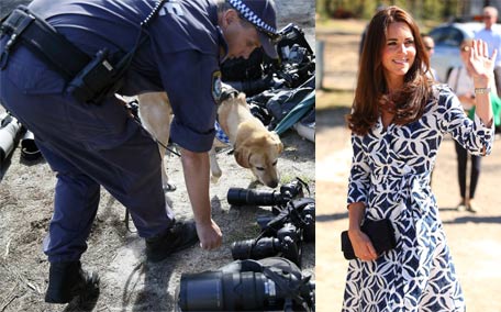 A police dog and his handler inspect cameras outside Sydney airport ahead of the arrival of Britain's Prince William, his wife Catherine, Duchess of Cambridge and their son Prince George in Sydney. (REUTERS)