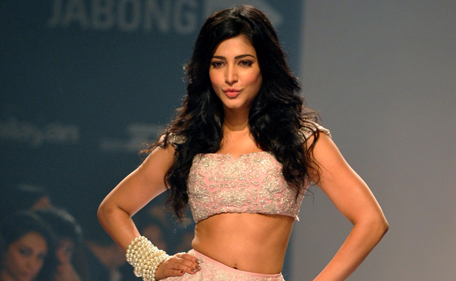 Indian Bollywood actress Shruti Hassan showcases a creation by designer Shehla Khan during Lakme Fashion Week (LFW) Winter/Festival 2014 in Mumbai on August 23, 2014. (AFP)