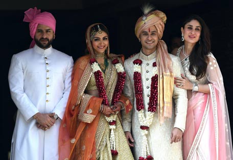 Sharmila Tagore (L) and Saif Ali Khan (R) pose during the wedding of Soha Ali Khan (2nd L) and Kunal Khemu. (AFP)