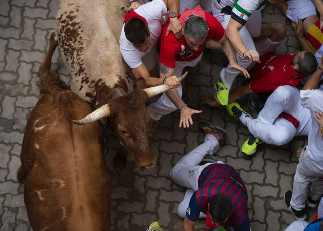 Runners are knocked down by a Pedraza de Yeltes fighting bull near the entrance to the bullring during the fourth running of the bulls at the San Fermin festival in Pamplona, northern Spain, July 10, 2016. (Reuters)