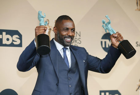 Idris Elba holds the awards for Outstanding Performance by a Male Actor in a Supporting Role for his role in "Beasts of No Nation" and for Outstanding Performance by a Male Actor in a Television Movie or Miniseries for his role in "Luther" as he poses backstage at the 22nd Screen Actors Guild Awards in Los Angeles, California January 30, 2016. (Reuters)
