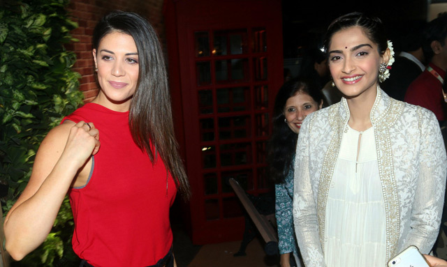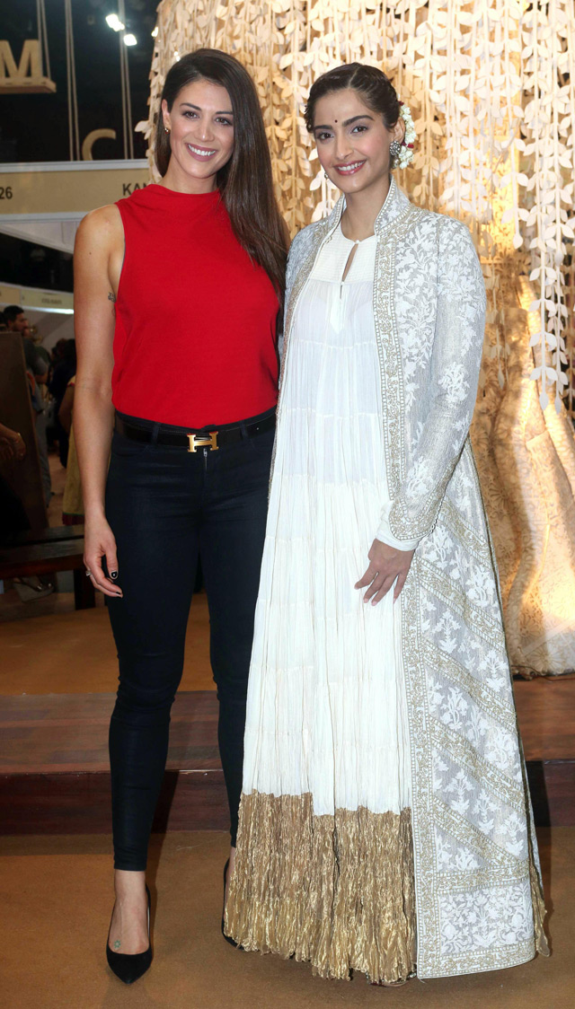 Olympic swimmer Stephanie Rice and Sonam Kapoor pose as they attend "The Women Entrepreneur Exhibition" in Mumbai.