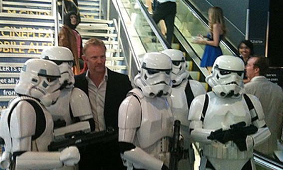 Morgan Spurlock stands with models decked out as Star Wars Stormtroopers for the Toronto International Film Festival premiere of his new documentary, "Comic Con: Episode IV - A Fan's Hope". (AFP)