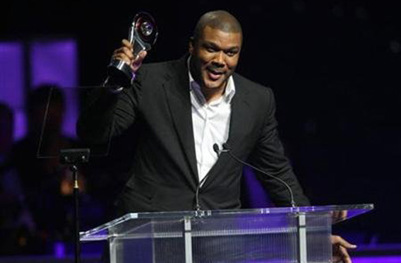 Filmmaker Tyler Perry, recipient of the CinemaCon Visionary Award, accepts his award during CinemaCon, the official convention of the National Association of Theatre Owners, in Las Vegas, Nevada. (REUTERS)