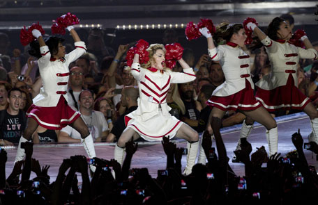 US pop icon Madonna (front) performs on stage during her first ever concert in the Gulf as part of her MDNA world tour at Abu Dhabi's Yas Island Stadium. (AP)