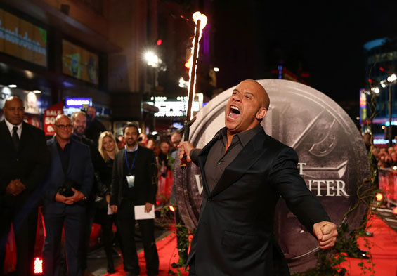 Vin Diesel runs towards photographers holding a flaming sword as he arrives on the red carpet to attend the European premiere of the film "The Last Witch Hunter" in London. (AFP)