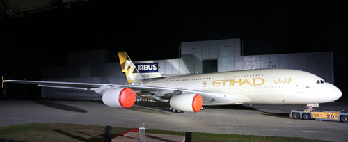 The new livery was unveiled as Etihad Airways’ first A380 rolled-out of the paint hangar at the Airbus Finkenwerder facility in Hamburg, Germany.