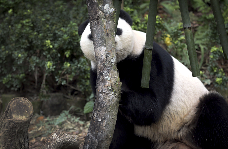 Jia Jia, a female Giant Panda hides behind her birthday treat of bamboo, Friday, Sept. 6, 2013, at the River Safari, part of the Wildlife Reserves and the Singapore Zoo in Singapore. Week-long celebrations were held to mark the first year anniversary of the arrival of two Giant Pandas from China, Kai Kai, and Jia Jia, who incidentally are celebrating their 6th and 5th birthdays, respectively this month. These Giant Pandas are on loan for 10-years as part of a collaboration between China and Singapore to raise awareness for the conservation of these critically endangered species.(AP)
