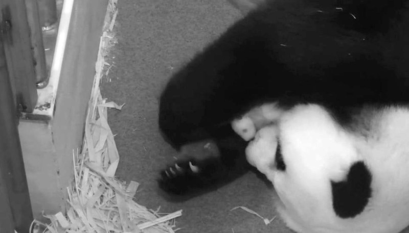 This handout photo provided by the Smithsonian's National Zoo, taken Aug. 29, 2013, shows teh zoo's Panda mother Mei Xiang with her cub at the zoo in Washington. The zoo said Thursday its 2-week-old giant panda cub is female. The Washington zoo also revealed Thursday that the cub's father is National Zoo panda Tian Tian. (AP)