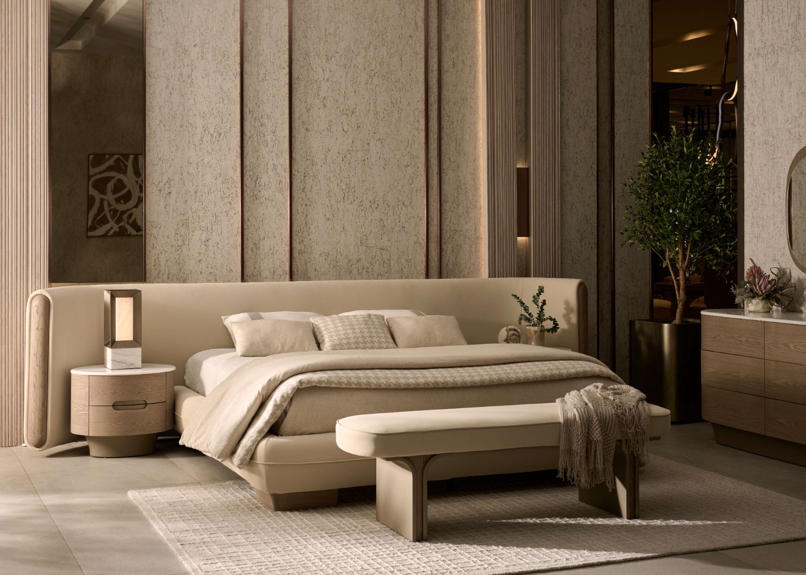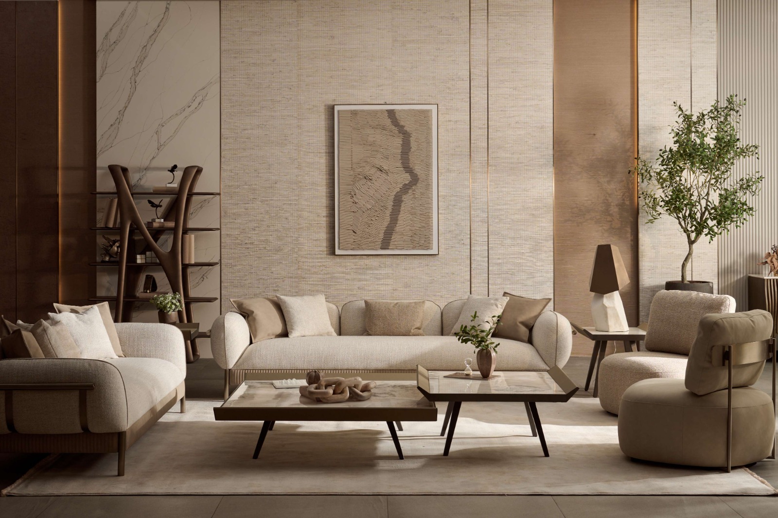 Grand curved sofas anchor the collection, their biomorphic forms softening architectural spaces with fluidity and depth. Intricate wood-and-metal detailing, paired with upholstery in leather, suede, and richly textured neutrals, creates a foundation that feels both elevated and inviting. These are pieces designed not just to be seen, but experienced—where proportion, comfort, and craftsmanship converge.