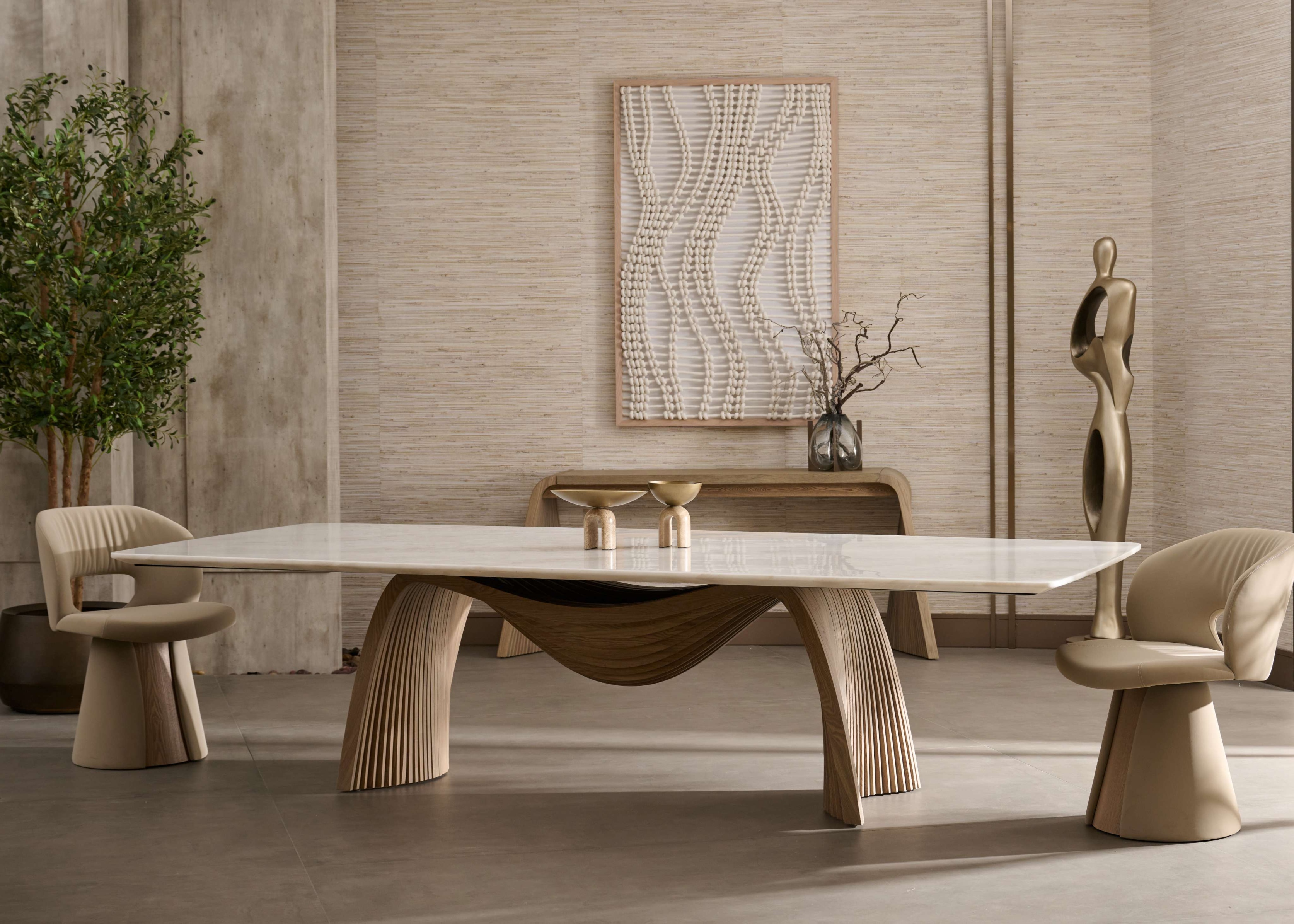 Complementing the seating, sculptural accent chairs introduce moments of character, while bold lighting installations shape atmosphere through shadow and glow. Dining tables rest on architectural bases, crowned with premium marbles sourced from Brazil, Italy, and Spain—each slab selected for its natural veining and quiet drama. Crafted in versatile dimensions, the designs respond to the evolving scale of modern homes.
