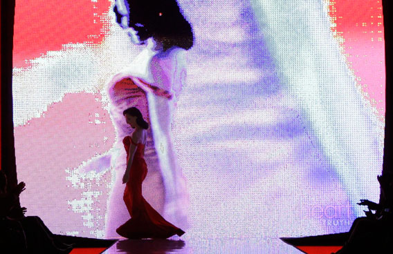 Dita Von Teese walks the runway in front of a huge video screen wearing a dress designed by Zac Posen during the Heart Truth Red Dress Fall 2011 show in New York. (AP)