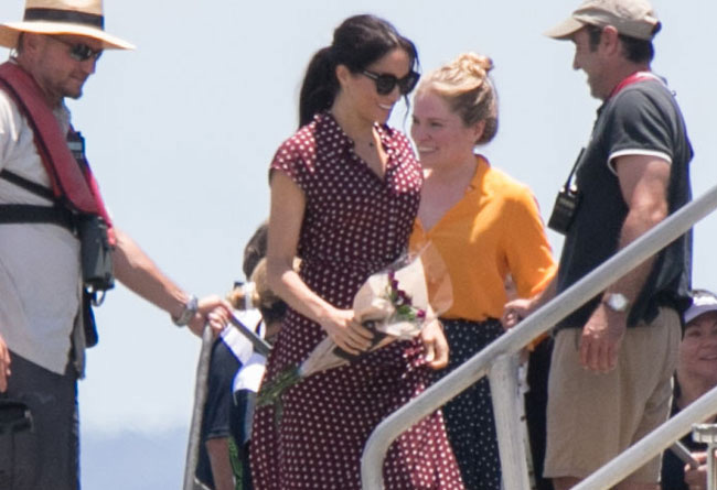 Duchess Meghan stepped out in an & Other Stories polka dot dress, priced at $163, as she and Prince Harry arrived at Fraser Island in Queensland on day seven of their royal tour of Australia on Monday.