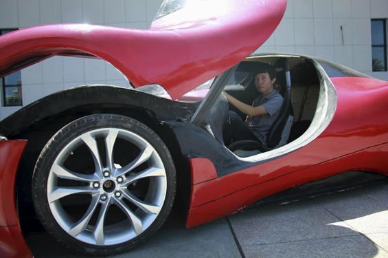 Chen Yinxi poses for a photograph with a car he built in Haikou, south China's Hainan province. (AFP)