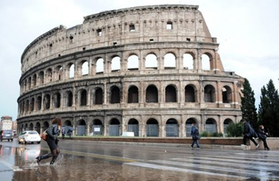 Italians cross a flooded street in front of the Colosseum in Rome. City authorities in Rome have teamed up with volunteers to clean off sticky chewing gum from its priceless archaeological sites and cobblestone streets. (AFP)