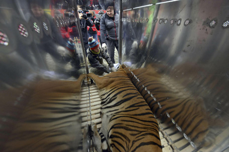 Four Paws vet activists conduct a final check on a tiger in a transport cage, after it was rescued from an ambulant circus in Weilburg, about 90 km (56 miles) from Frankfurt. (REUTERS)