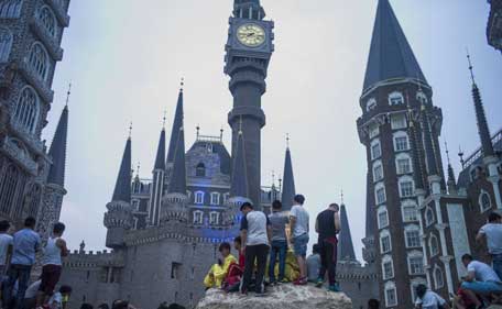 In a picture taken on June 16, 2015, people gather in front of the campus of Hebei Academy of Fine Arts after a graduation ceremony in Xinle, Hebei province. A Chinese university has earned comparisons with Harry Potter's Hogwarts due to its bizarre castle campus, but local traditions supplied the magic at a Confucian-style ceremony for its degree graduates. (AFP)