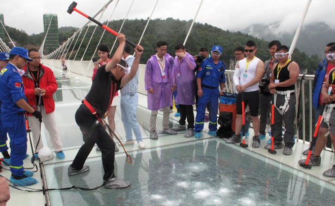 To further convince the public of the sturdiness of the 430-meter bridge tucked between two steep cliffs at Zhangjiajie which is 300 meters above the ground, 20 volunteers used hammers to try to smash the glass.