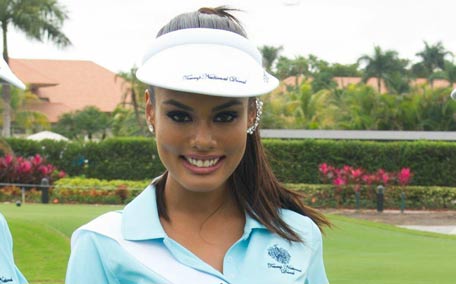 Chanel Beckenlehner, Miss Canada 2014, taking part in the OPTX Eyewear putting contest at Trump National Doral Miami. (AFP)