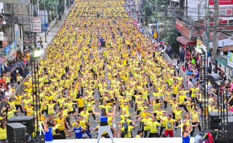 Clad in bright yellow shirts, 12,975 people filled the streets to follow the steps of instructors lifted above the crowds on stages scattered throughout the neighborhood.