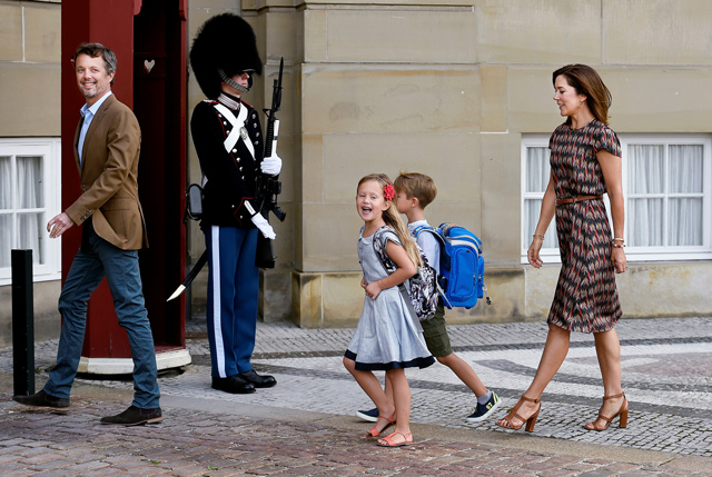 Danish Crown Prince Frederik and Crown Princess Mary are photographed with their twins Prince Vincent and Princess Josephine in front of Amalienborg Castle on the siblings' first day of school, in Copenhagen, Denmark, August 15, 2017.