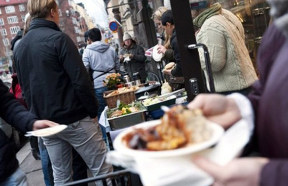 People queue up at a pop up restaurant set up as part of Restaurant Day in Helsinki. On a Helsinki street corner, a Finnish family savours Indian deep-fried lentil patties with yoghurt and chutney, devouring the rich, exotic morsels for much-needed warmth in the November chill. (AFP)