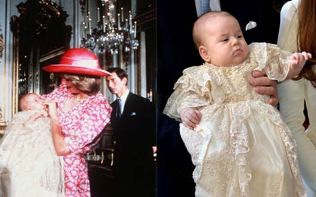 Prince George arrive at Chapel Royal in St James's Palace in London, for the christening of the three month-old Prince Wednesday Oct. 23, 2013. (AP) Diana, Princess of Wales holds baby Prince William as Prince Charles, Prince of Wales looks on at William's christening in the music room at Buckingham Palace on August 04, 1982 in London, England . (Photo by Getty Images)