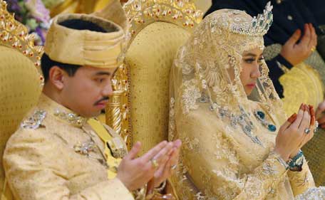 Brunei's newly wed royal couple, Prince Abdul Malik and Dayangku Raabi'atul 'Adawiyyah Pengiran Haji Bolkiah, pray during the 'bersanding' or enthronement ceremony at their wedding in the Nurul Iman Palace in Bandar Seri Begawan April 12, 2015. (Reuters)