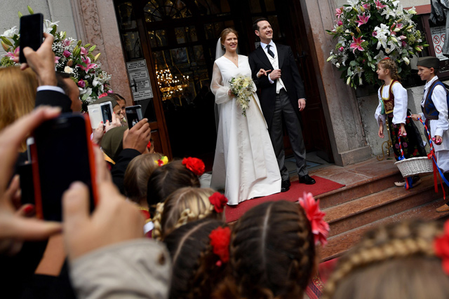 Prince Philip of Serbia, also known as Filip Karadjordjevic (C-R), his bride Danica Marinkovic (C), relatives and guests, including former Queen Sofia of Spain (4th R) pose for a group photo following the wedding ceremony.