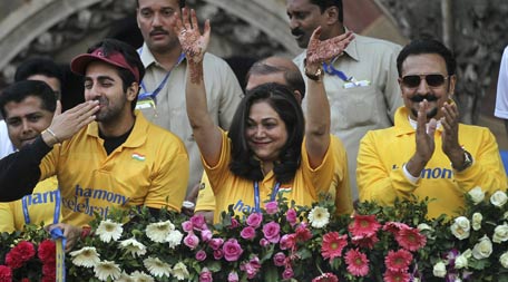 Ayushman Khurana, left, Tina Ambani, centre, and Gulshan Grover cheer runners during the Mumbai Marathon in Mumbai. (AP)