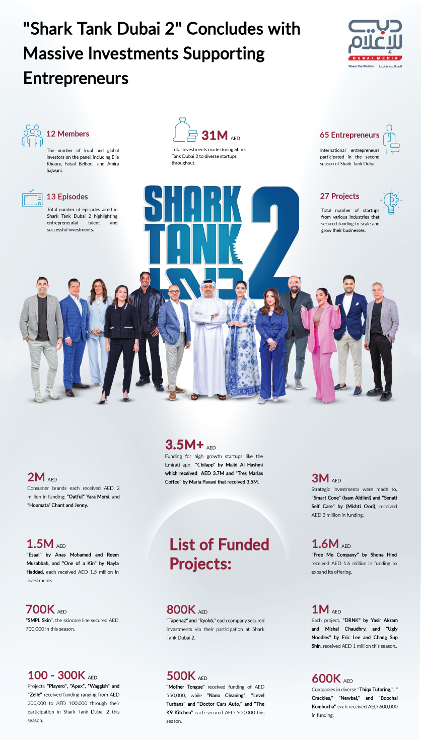 The second season of "Shark Tank Dubai" concluded with impressive outcomes, as AED 31 million was invested in various entrepreneurial ventures. The show brought together 65 international entrepreneurs and featured 27 projects spanning multiple industries. These startups secured funding to expand and scale their businesses, showcasing Dubai's growing reputation as a global hub for innovation and entrepreneurship.