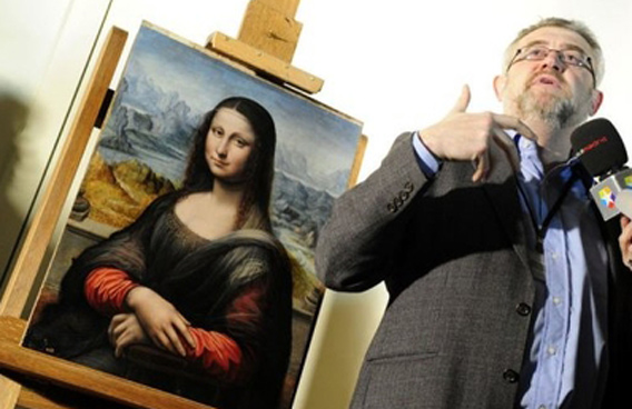 Head Curator for the Department of Italian Renaissance Painting at the Prado Museum, Miguel Falomir talks to the press next to an authenticated contemporary copy of Leonardo da Vinci's Mona Lisa presented at the Prado Museum. Spanish curators think the painting is the earliest ever copy, painted in the artist's own studio and looking younger and more ravishing than the original. (AFP)