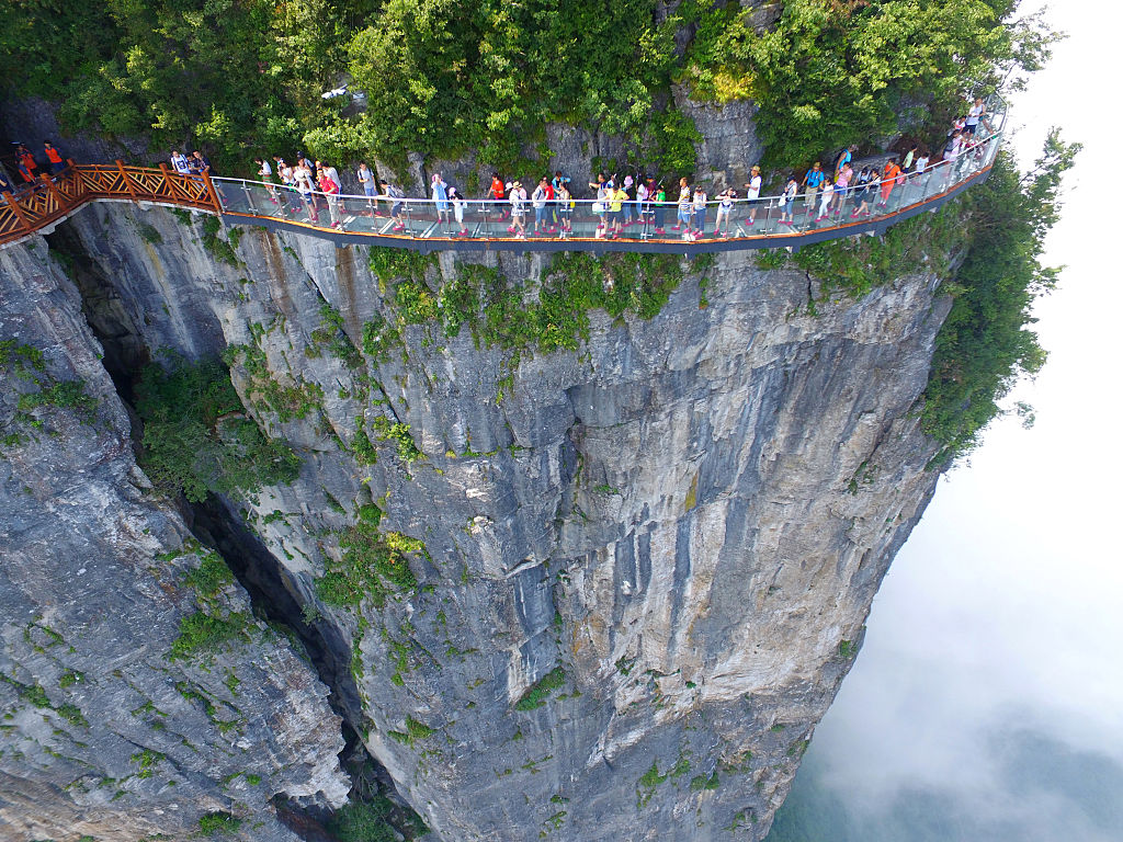 Called the Coiling Dragon Cliff skywalk, it overlooks Tongtian Avenue, a mountain road with 99 turns that snakes up the mountain in Hunan’s Zhangjiajie National Forest Park.