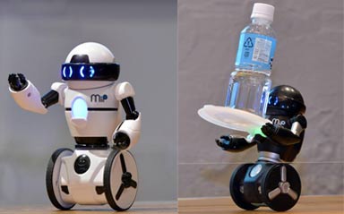 A two-wheel robot "MiP", carrying a water bottle on a tray, keeps balance for a demonstration as Japanese toy maker Tomy introduces the new toy robot in Tokyo. (AFP)