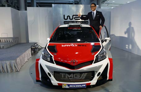 Toyota Motor Corp President Akio Toyoda poses for pictures next to "Yaris WRC", a vehicle in development for the FIA World Rally Championship (WRC), during a news conference to announce Toyota's return to WRC in 2017, in Tokyo. (Reuters)