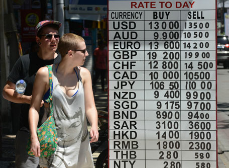 Foreign tourists walk past a money changer at Kuta on Bali island on March 17, 2015. Indonesia will soon allow tourists from an additional 30 countries to visit without a visa, a minister said, but neighbouring Australia was left off the list amid a row over looming executions. (AFP)