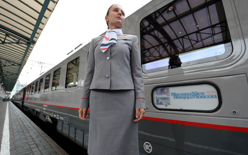 A conductor of a new luxury train running between Moscow and Nice waits on the platform at Moscow's Belorussky station before the train begins its first run in a flashback to the Tsarist times when Russian aristocrats flocked to the French Riviera. (AFP)