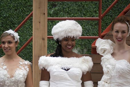 Models prepare to present creations during the 10th annual toilet paper wedding dress contest in Midtown, New York. (REUTERS)