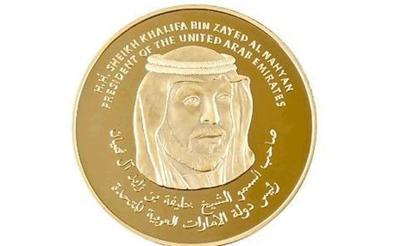The 24-carat, five-ounce gold coin features the portrait of President Sheikh Khalifa (SUPPLIED)